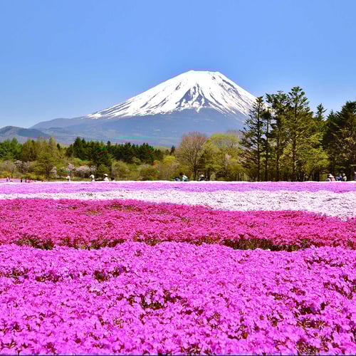 The Fuji Shibazakura (Moss Phlox) Festival is known for its vibrant, colorful flowers that cover the ground like a pink carpet. Visitors can enjoy a stunning sight as they walk through fields of pink, white, and purple blooms - it's a photographer's dream!
