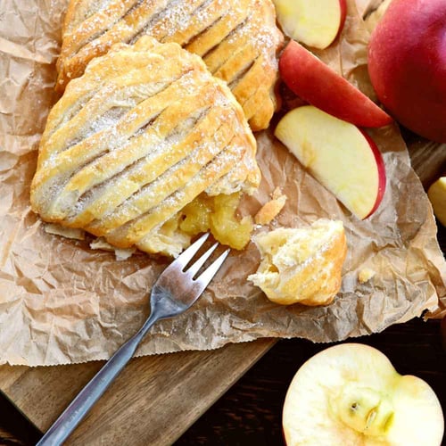For something a little bit different (and easier to eat), why not make mini turnovers? Just use smaller pieces of puff pastry, cut into circles or squares, fill with your favorite apples and bake in the oven.