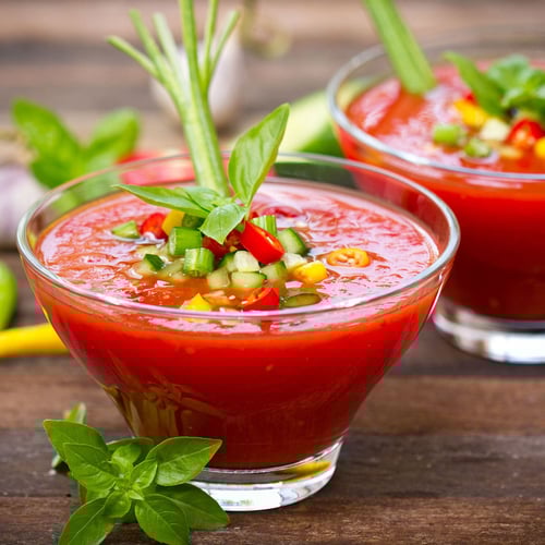 Gazpacho is a chilled soup that is perfect for summertime. Its light and fresh flavors make it the perfect meal to cool you down on a hot day. Plus, there's no need to heat up your kitchen since it's served cold!